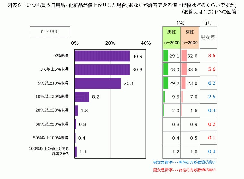 「いつも買う日用品・化粧品が値上がりした場合、あなたが許容できる値上げ幅はどのくらいですか」(図表6)と聞くと、「3%未満」が30.9%、「3%以上5%未満」が30.8%、「5%以上10%未満」が26.1%です。ここまでの合計で9割近くになるため、10%以上の値上がりはほとんどの人が許容できないと感じるようです。