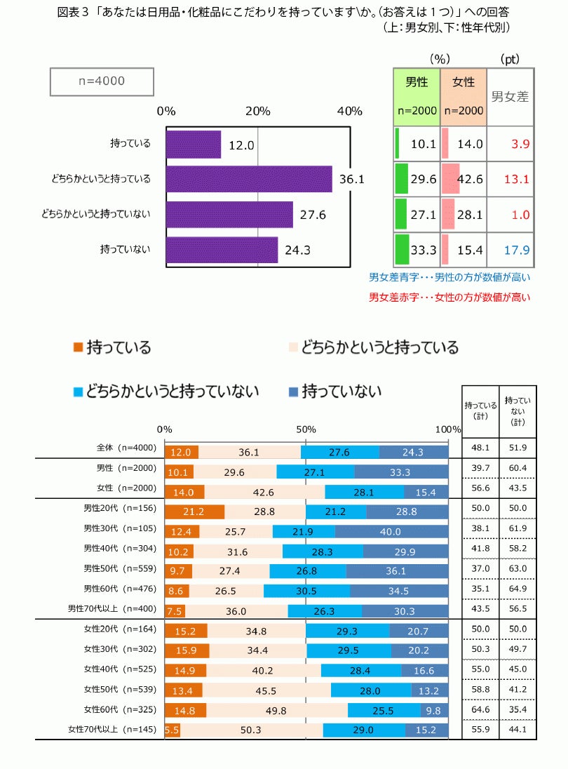 「あなたは日用品・化粧品にこだわりを持っていますか」(図表3・上)と聞いたところ、「持っている」(12.0%)「どちらかというと持っている」(36.1%)、「どちらかというと持っていない」(27.6%)、「持っていない」(24.3%)という結果になりました。