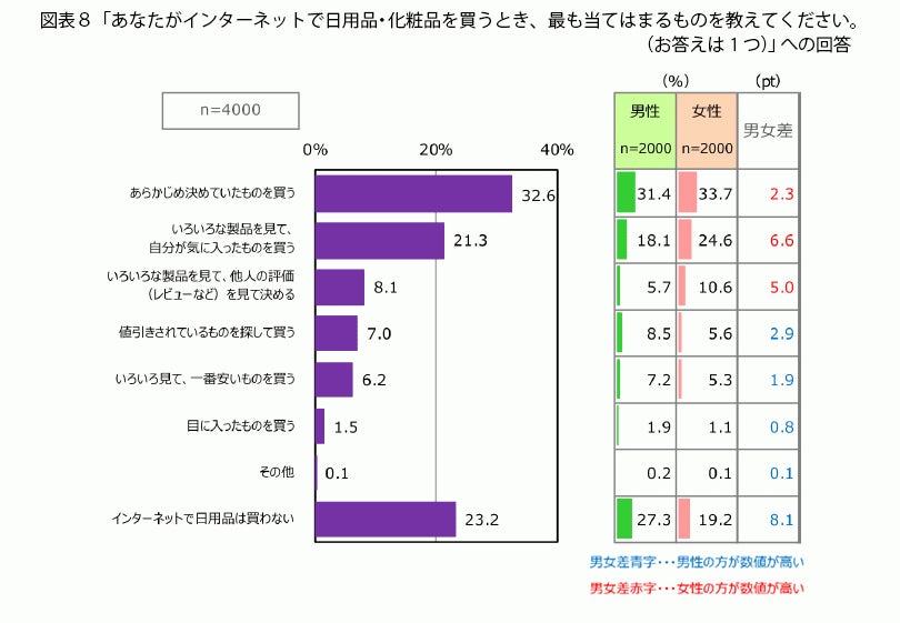 インターネット以外の店舗で購入するとき(図表7)、インターネットで購入するとき(図表8)で、日用品の買い方に違いは生まれるのでしょうか。