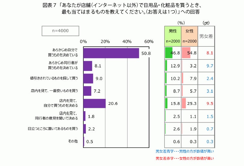 インターネット以外の店舗だと「あらかじめ自分で買うものを決めている」(50.8%)、「店内を見て、自分で買うものを決める」(20.6%)が高く、「値引きされているものを探して買う」(9.0%)、「店内を見て、一番安いものを買う」(7.2%)という人はあまり多くありません。