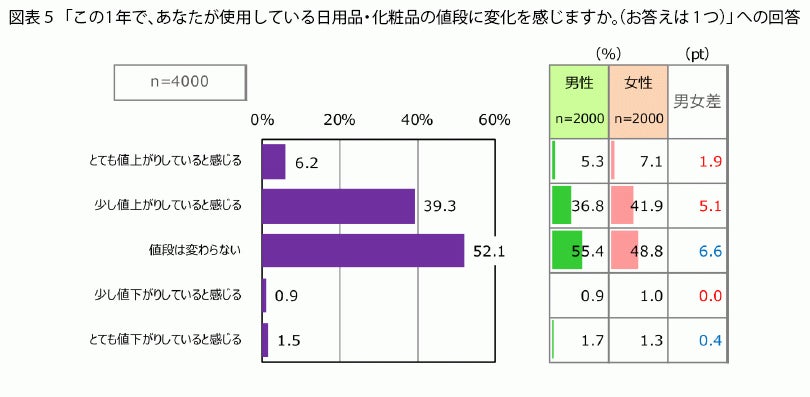 国民的駄菓子「うまい棒」が10円から12円に値上げするというのが、ニュースになりました。「うまい棒」に限らず、最近では「量が減って値段は据え置き」というニュースをよく聞きます。では日用品類はどうでしょう。「この1年で、あなたが使用している日用品・化粧品の値段に変化を感じますか」(図表5)と聞くと、大半の人が「値段は変わらない」(52.1%)と感じています。ただ、「少し値上がりしていると感じる」人も39.3%と、かなりの割合です。