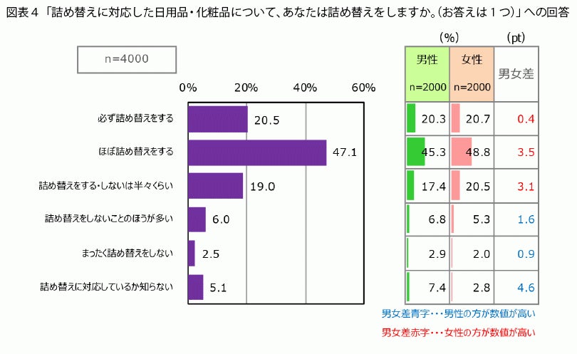「詰め替えに対応した日用品・化粧品について、あなたは詰め替えをしますか」と質問すると、いろいろなメリットがあるからか、「ほぼ詰め替えをする」と回答した人が47.1%と半数近くになりました。男女差は3.5ポイントと、性別による違いはほとんどありません。「必ず詰め替えをする」という人も20.5%と結構高い数字です。