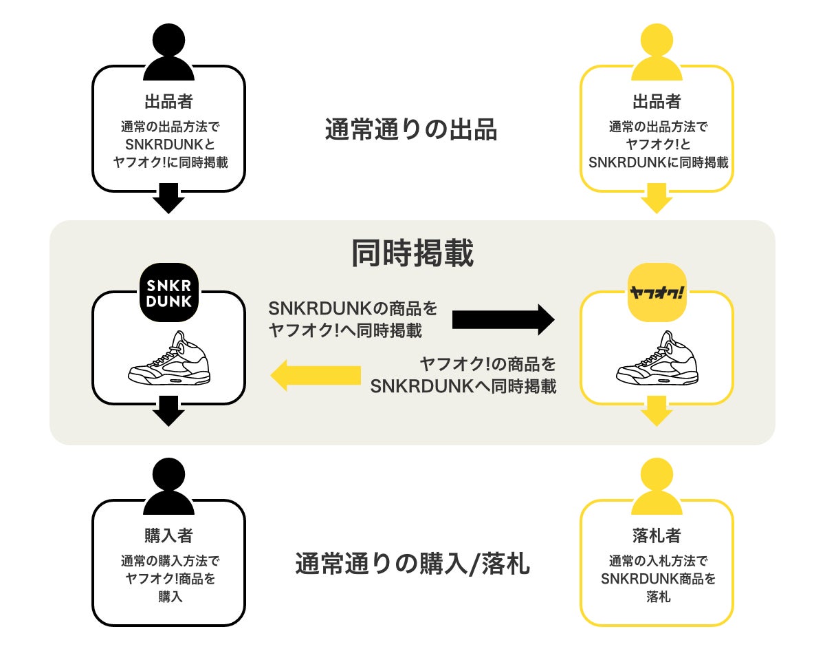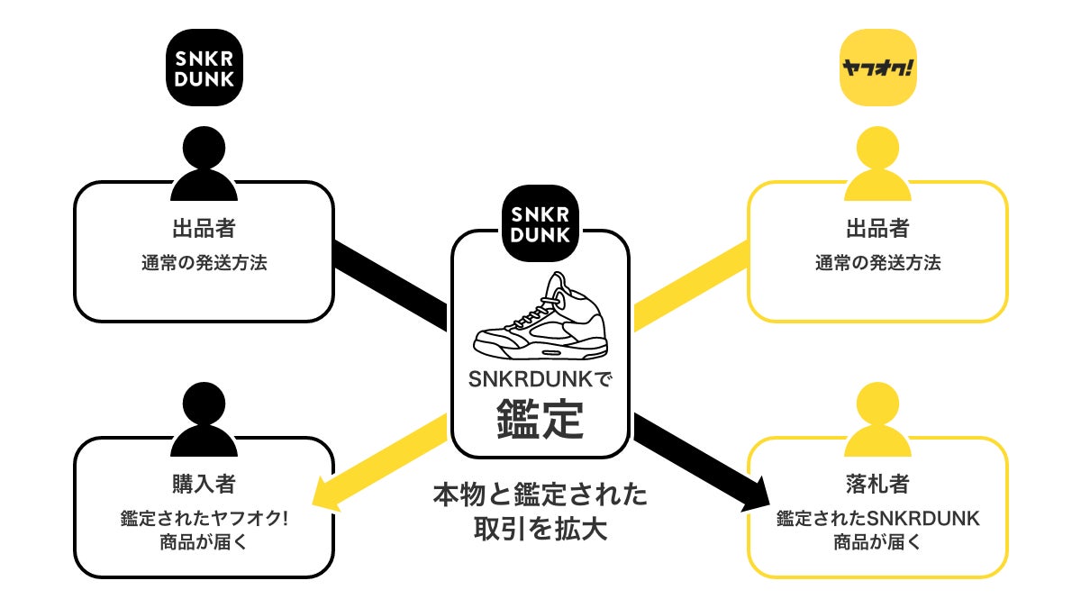 「ヤフオク!」と「スニーカーダンク」は、「スニーカー」「ストリートウェア」「ハイブランド」カテゴリの商品在庫を相互連携し、取引の際に「スニーカーダンク」による「真贋鑑定」を行います。(※2)これにより、「ヤフオク!」ユーザーは追加の負担なく、真贋鑑定された、より安全安心な個人間取引を楽しめます。
