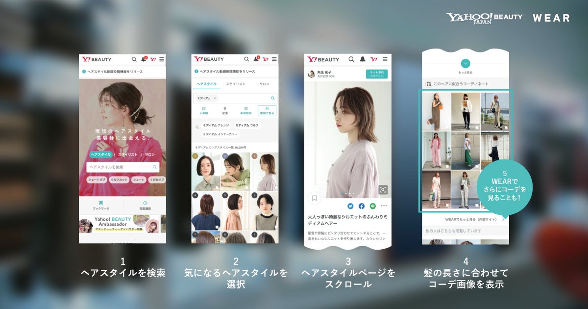 ヤフー株式会社(以下、Yahoo! JAPAN)が提供するヘアサロン・スタイリスト・ヘアスタイル探しサービス「Yahoo! BEAUTY」は、株式会社ZOZO(以下、ZOZO)が提供するファッションコーディネートアプリ 「WEAR」と連携し、ヘアスタイル探しの際に、ロングからベリーショート、ボウズまでそれぞれの髪の長さに合わせてWEARユーザーのファッションコーディネート画像が見られる「コーディネート表示機能」(以下、本機能)の提供を開始しました。(※1)「Yahoo! BEAUTY」が「WEAR」と連携し機能を提供するのは初めてで、夏に向けた季節の変わり目にも、新しいヘアスタイル探しやそれに合わせた新しいファッションとの出会いをサポートします。