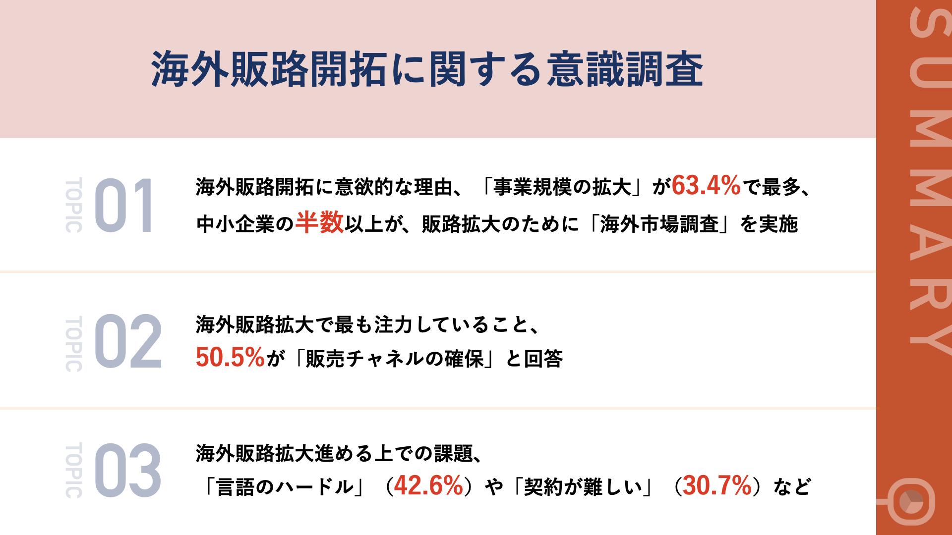 - 中小企業の半数以上が、販路拡大のために「海外市場調査」を実施