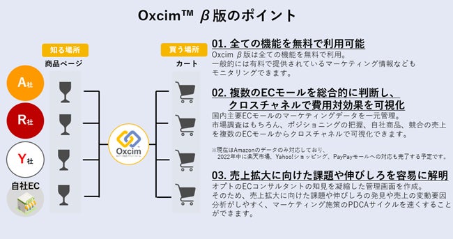 「デジタルで、この国の新しい基本をつくる。」をミッションに掲げ、顧客の事業成長に伴走する株式会社オプト(本社:東京都千代田区、代表取締役社長 CEO:栗本 聖也、以下、オプト)は、ECモールに商品を出品するメーカー企業様向けに、複数のECモールを総合的に判断し、クロスチャネル(※1)で最適化を目指す、業界初(※2)のSaaS(※3)「Oxcim™️ (オキシム) β版」の提供を、本年6月13日(月)より無料で開始したことをお知らせいたします。