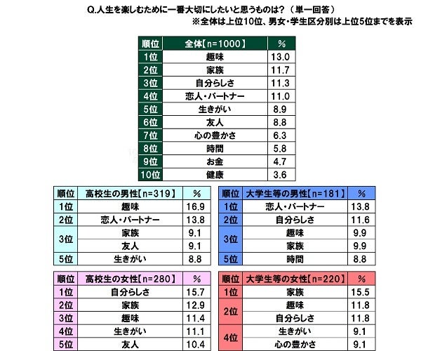 - 人生を楽しむために一番大切にしたいと思うもの 高校生の男性では1位「趣味」、高校生の女性では1位「自分らしさ」 大学生等の男性では1位「恋人・パートナー」、大学生等の女性では1位「家族」