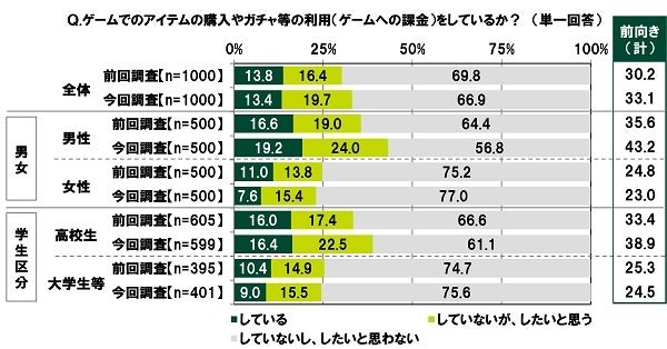 - 「ゲーム課金に前向き」高校生の39%、大学生等の25% 高校生では前回調査より6ポイント上昇
