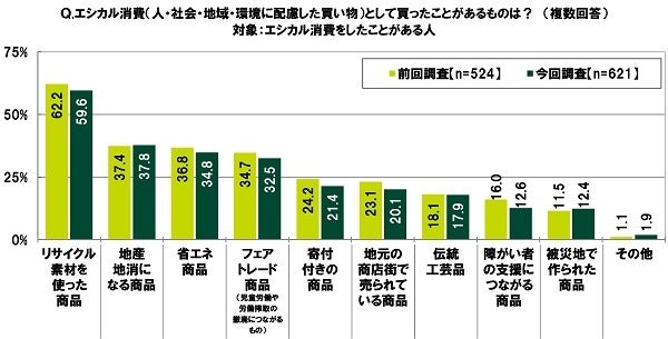 エシカル消費をしたことがある人(621名)に、エシカル消費として買ったことがあるものを聞いたところ、「リサイクル素材を使った商品」(59.6%)が突出して高くなり、「地産地消になる商品」(37.8%)、「省エネ商品」(34.8%)、「フェアトレード商品(児童労働や労働搾取の撤廃につながるもの)」(32.5%)、「寄付付きの商品」(21.4%)が続きました。