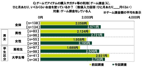 前回の調査結果と比較すると、ゲーム課金に前向きな人の割合は、男性では7.6ポイントの上昇(前回調査35.6%→今回調査43.2%)、女性では1.8ポイントの下降(前回調査24.8%→今回調査23.0%)、高校生では5.5ポイントの上昇(前回調査33.4%→今回調査38.9%)、大学生等では0.8ポイントの下降(前回調査25.3%→今回調査24.5%)となりました。