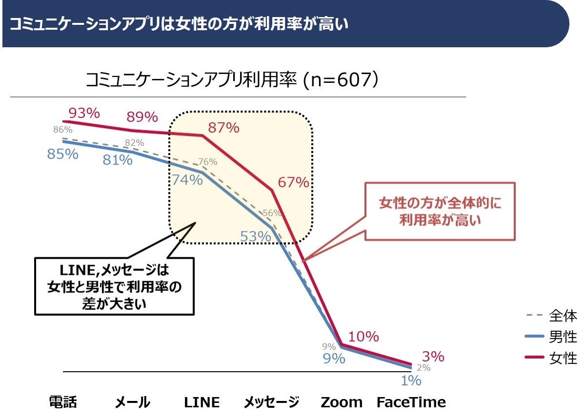 コミュニケーションアプリは女性の方が全体的に利用率が高い傾向にあり、特に、LINE、メッセージは男女差が大きいことがわかります。