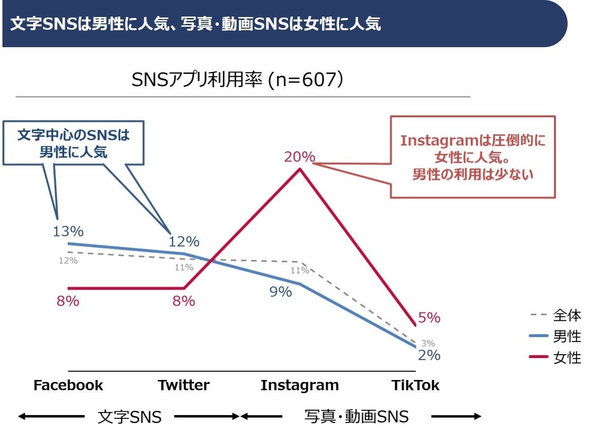 動画や写真を中心としたInstagramは女性の間で人気であり、一方、文字中心のFacebook、Twitterは男性に人気があることがわかりました。