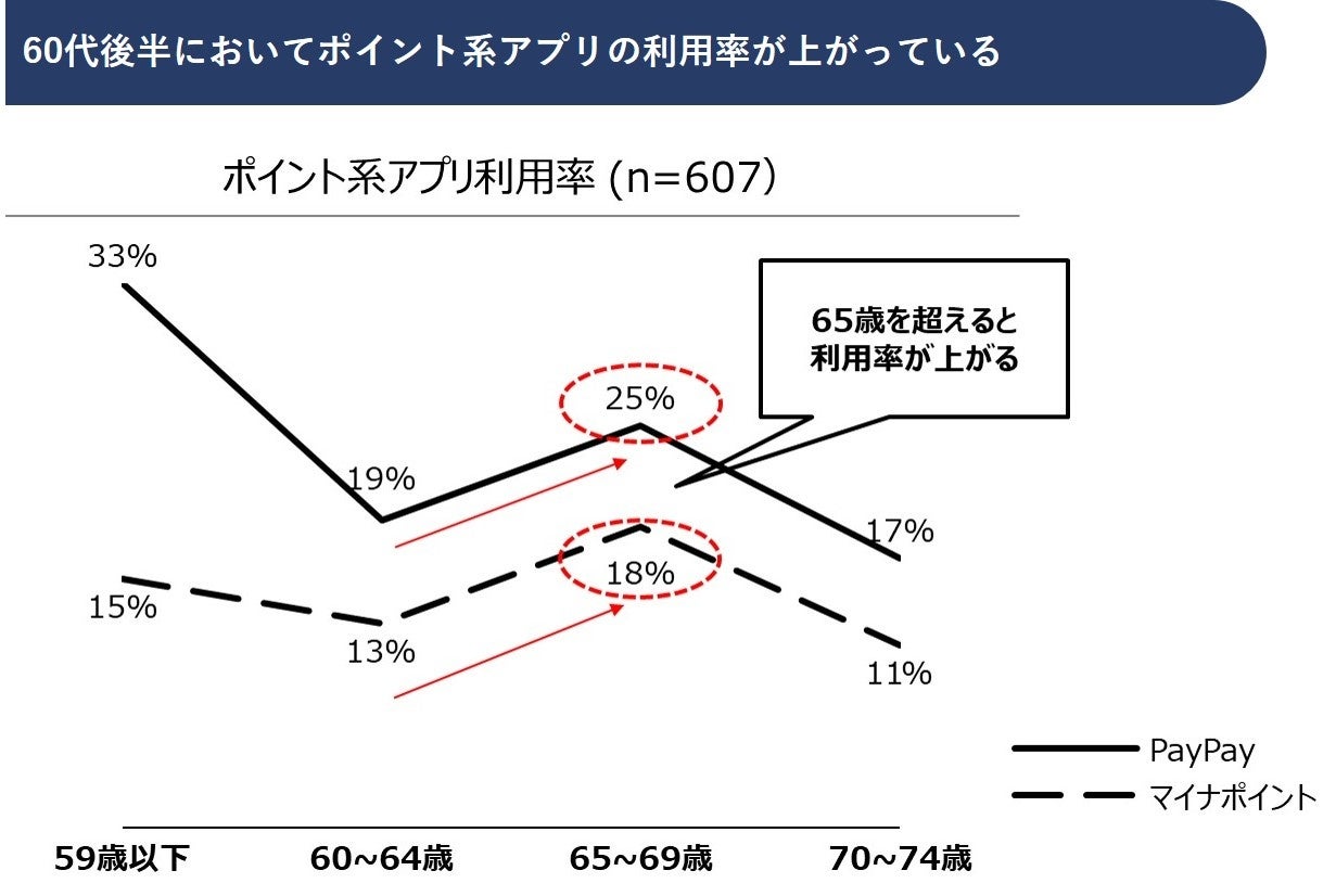 マイナポイント、PayPayなどのポイントアプリは60代後半においての利用率が上昇しています。