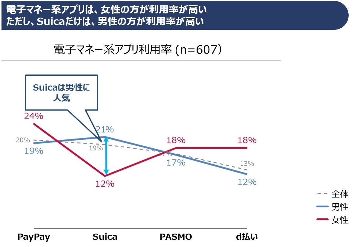 Suicaの利用に関しては、男性21%に対し女性が12%と男性の方が利用率が高いことがわかります。