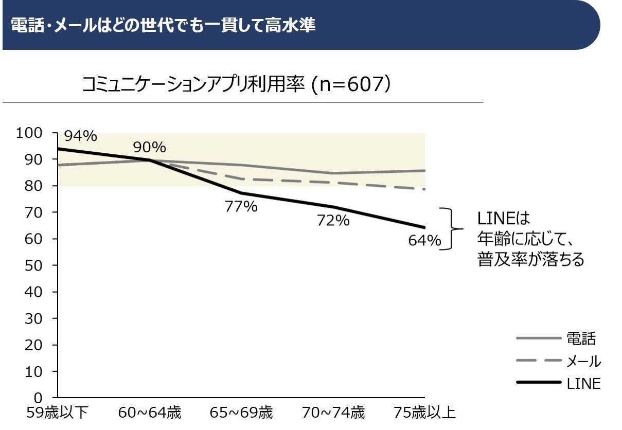 LINEについては65歳を越えると、電話・メールに比べ年齢とともに徐々に利用率が減少していることがわかります。