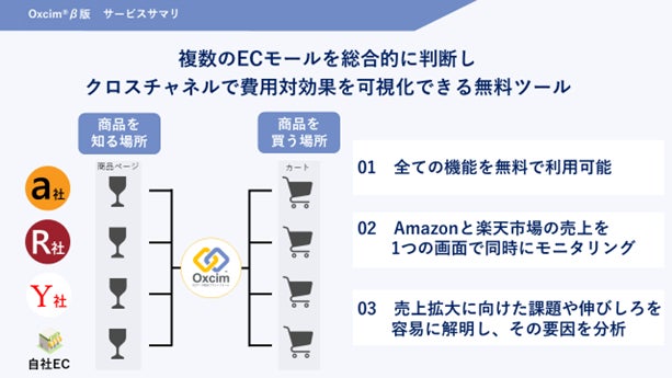 「デジタルで、この国の新しい基本をつくる。」をミッションに掲げ、顧客の事業成長に伴走する株式会社オプト(本社:東京都千代田区、代表取締役社長 CEO:栗本 聖也、以下、オプト)は、複数のECモールを総合的に判断し、クロスチャネル(※1)で最適化を目指す業界初(※2)のSaaS(※3)「Oxcim® (オキシム) β版」において、本年9月20日より楽天市場のECデータ分析できるようチャネル拡大をしたことをお知らせいたします。