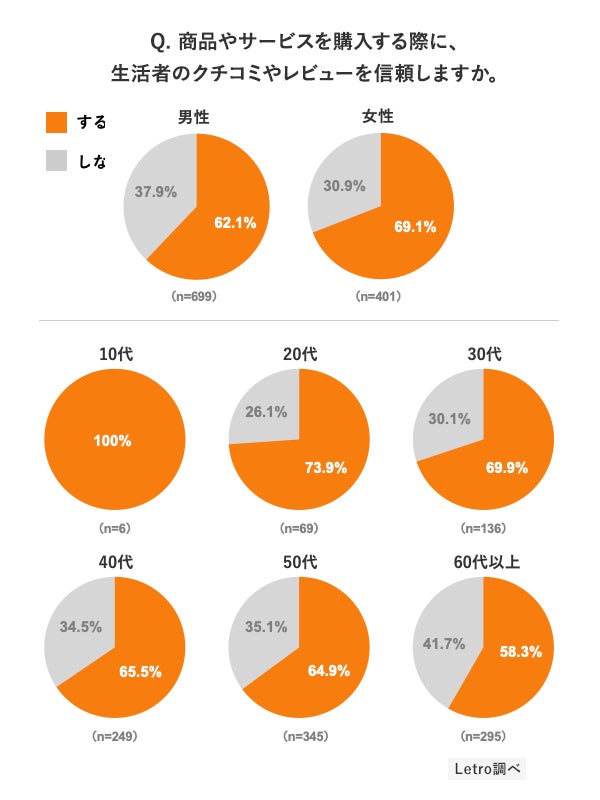 まずはじめに「商品・サービスの購入時に、UGCを信頼するか」について聞いたところ、全体で64.6%の方がUGCを信頼するという結果になりました。特に、女性と30代までの若い層ほど高い傾向にあります。「購買行動におけるUGCの信頼性」に関するデータとして良く知られるニールセンデジタルの2019年発表の調査では、「購買の際にUGCを信頼する」と回答した30代の生活者が33%(2017年)から45%(2019年)に増加していましたが、本調査では69.9%にまで上昇しており、UGCの信頼度が年々高まっていることがわかります。