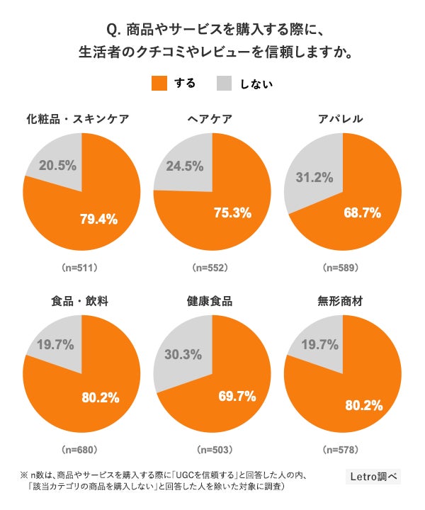 「商品・サービスの購入時に、UGCを信頼する」と回答した方に対して、商品カテゴリ別に「商品・サービスの購入時に、UGCを信頼するか」と聞いたところ、UGCの信頼度が高まるカテゴリは、順に「無形商材(80.2%)」「化粧品・スキンケア(79.4%)」「ヘアケア(75.3%)」の順に高い結果となり、商品やサービスを購入するときに「UGCを信頼する」と回答した人の中でも、商品カテゴリによってUGCの信頼度が異なることがわかりました。