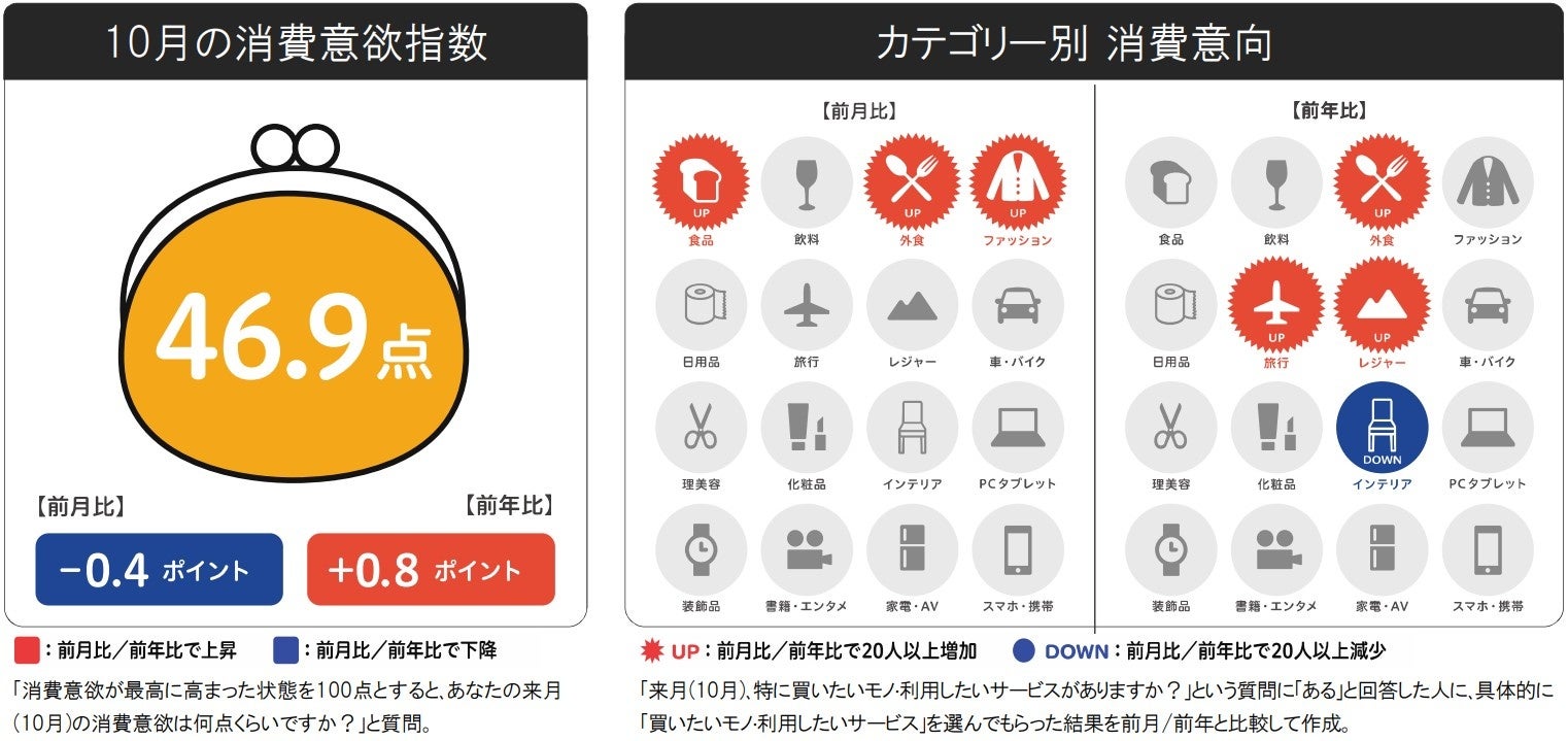 2022年10月の消費意欲指数は46.9点。前月比は-0.4ptの横ばい、前年比では+0.8ptの微増となりました。
