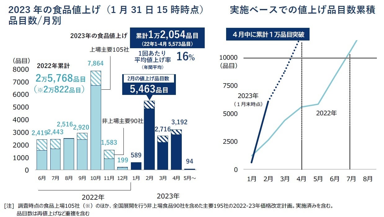 このうち、2023年2月単月の値上げは加工食品を中心に5463品目となり、前年同月(1420品目)に比べて3倍規模に達したほか、22年以降の単月では最多の22年10月(7864品目)に次ぐ2番目の多さ、23年中では最多となる。
