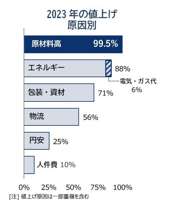 前年の主な値上げ要因だった円安は一服感もあるものの、引き続き原材料価格の高止まりに加え、物流コストや輸入コスト上昇が続き、製品価格へ緩やかに反映する動きが目立つ。2023年に予定される値上げ約1.2万品目のうち、原材料高が理由となったものは99%以上(品目数ベース)と、ほぼ全てで原材料高が理由にあげられた。一方で、原油高などのエネルギー(88%)、プラスチック容器などの包装・資材(71%)のほか、円安(25%)なども理由にあがった。