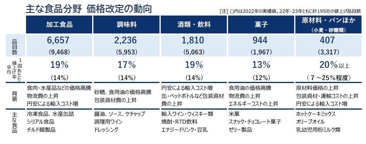 [注2] 品目数および値上げは、各社発表に基づく。また、年内に複数回値上げを行った品目は、それぞれ別品目としてカウントした。値上げ率は発表時点における最大値を採用した。なお、価格据え置き・内容量減による「実質値上げ」も対象に含む