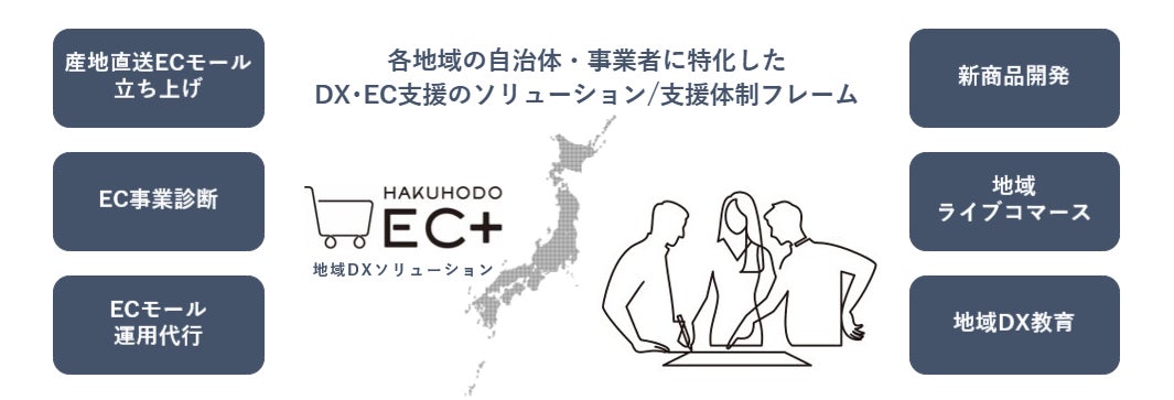 株式会社博報堂(本社:東京都港区、代表取締役社長:水島正幸、以下博報堂)のEC領域に特化した組織横断型プロジェクト「HAKUHODO EC+」は、博報堂DYグループ「ショッパーマーケティング・イニシアティブ®(※)」の取り組みとして、日本各地域の地方自治体・事業者のDX・EC支援を行うための「地域DXソリューション」を提供開始いたしました。 「産地直送ECモール立ち上げ」「EC事業診断」「ECモール運用代行」「新商品開発」「地域ライブコマース」「地域DX教育」の6つのソリューションで、各地域に即した課題解決や運用の支援を行います。