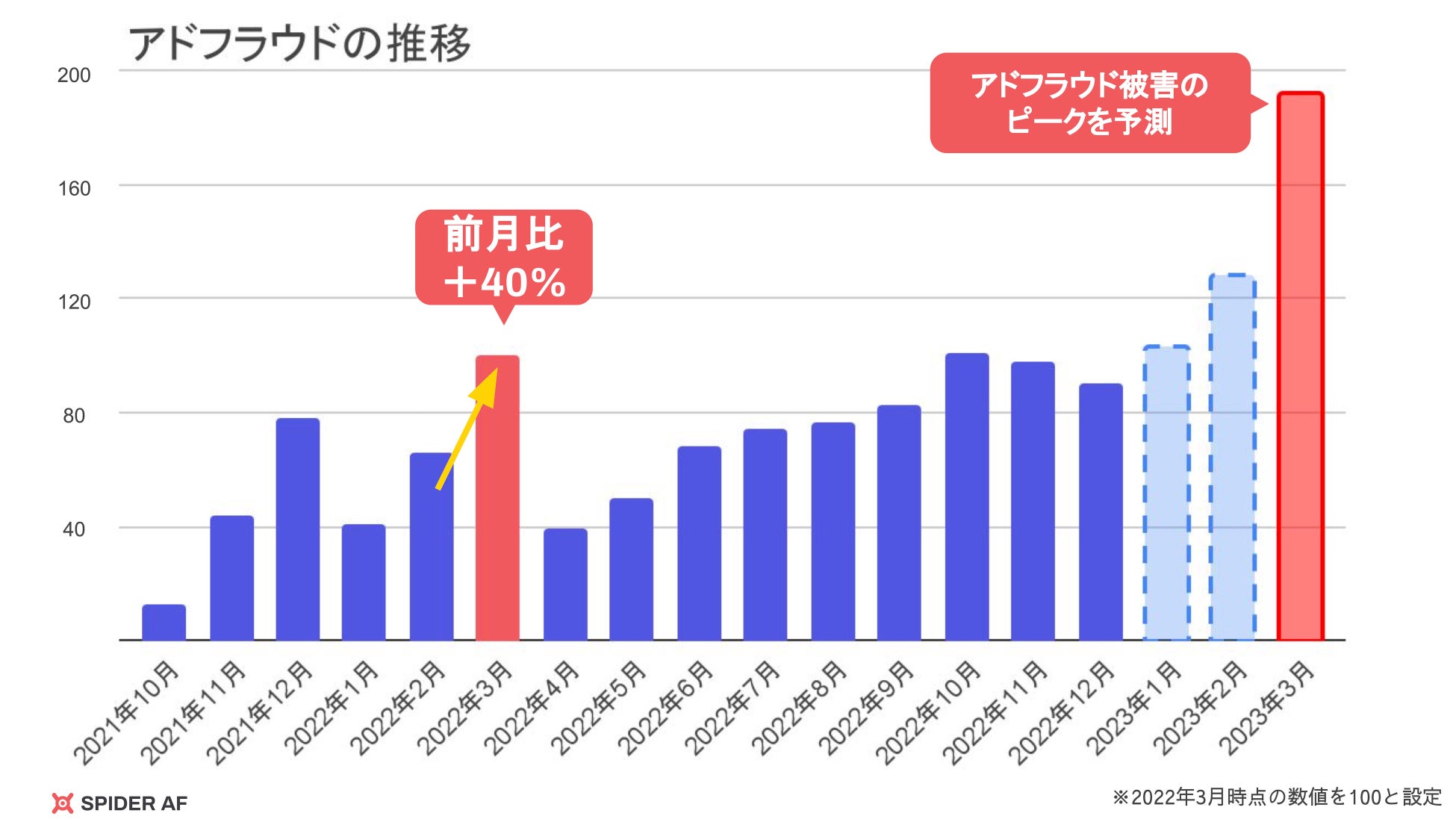 また、アドフラウドによる被害が2021年10月から右肩上がりであり、2023年3月にアドフラウド被害はピークを迎えると予測します。