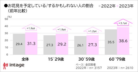 GW期間中に旅行に行くかどうかについては、「行く(”行く”と”たぶん行く”の合計)」と回答した人は調査時点で26.5%と前年から9.3ポイント増加しました。コロナ禍前である2019年は26.3%で、旅行意欲はコロナ禍前と同等まで回復しているといえます(図表6)。性年代別でみると、男女とも若い年代ほど旅行意向が高くなる傾向がみられます。「行く(”行く”と”たぶん行く”の合計)」との回答は、男性29歳以下が40.2%(前年29.0%)、女性29歳以下が37.3%(同23.7%)であるのに対し、男性70代は19.5%(同11.0%)、女性70代は14.6%(同8.2%)となっています。なお、いずれの世代も大きく回復しています(図表7)。
