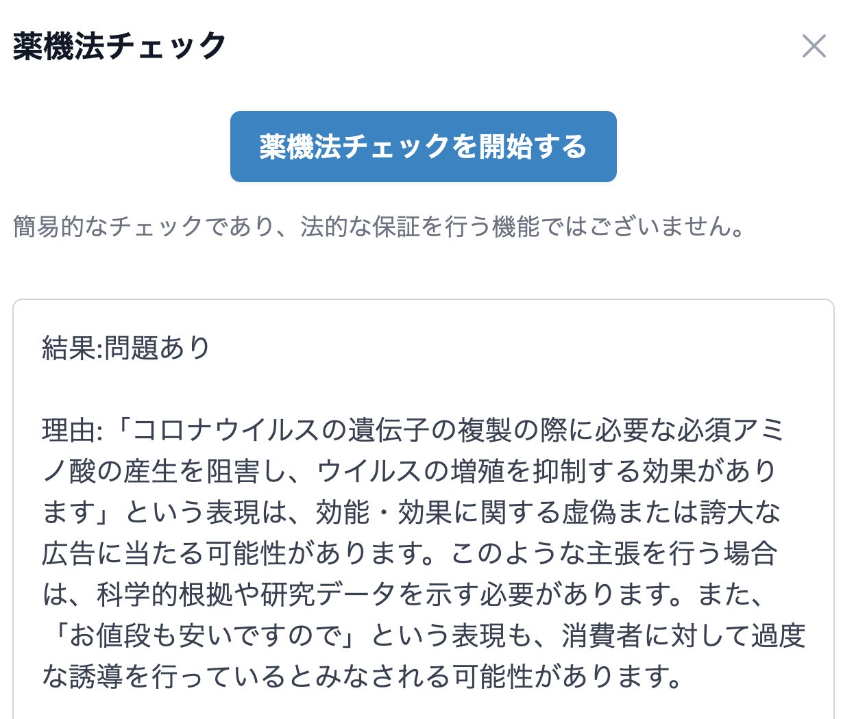 上記課題を解決するために、GPT-4もしくはお客様の作成した文章が、日本の薬機法に対応しているかどうかを自動でチェックする機能をリリースいたしました。