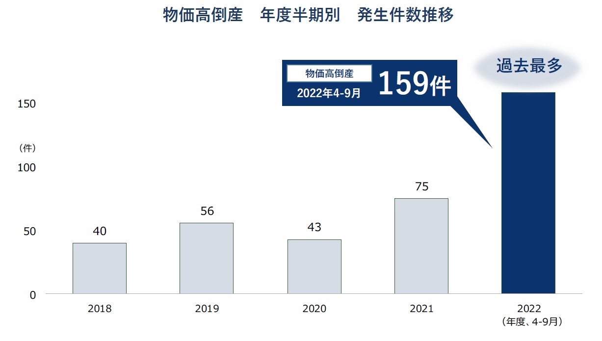 「物価高(インフレ)倒産」は、2023年4月において75件(前年同月12件、525.0%増)発生、過去最多であった前月(67件)を超え、10カ月連続で過去最多を更新した。また、2018年1月に集計を開始して以来、累計で1000件を超えた。業種別にみると、資材価格の高止まりが続く『建設業』(23件)が最多、『製造業』『運輸・通信業』(13件)の順となった。