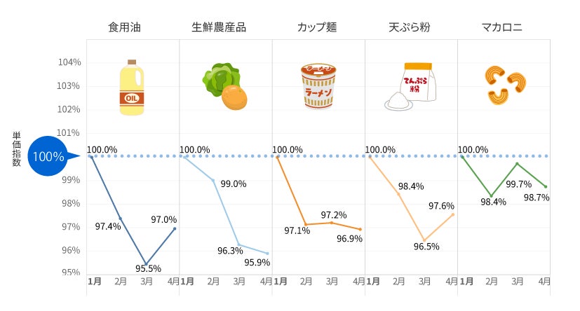 今年に入り多くの商品価格が上昇する中、2月~4月にスーパーマーケットで値下がりした商品を調査しました。1月の単価を基準(100%)とし、2月~4月の同一店舗同一商品の単価を売上数量で加重平均して単価指数化をしています。その結果、食用油が最も値下がりしており3月は基準となる1月比4.5%減となりました。また、野菜などの生鮮農産品も4月には同4.1%減、カップ麺は同3.1%減など、我々の日常に欠かせない商品の値下がりが明らかとなりました。価格高騰が続く今、日々の商品価格に着目することは、家計節約の一助となるかもしれません。