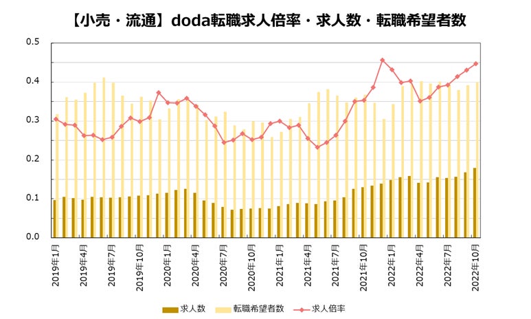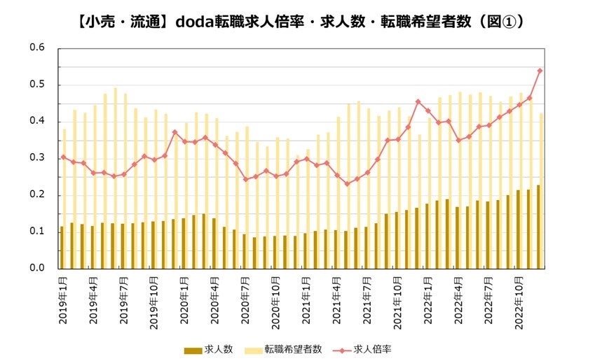 小売・流通業界の求人数、転職希望者数は調査開始以来、過去最多。しかし、異業種転職の人気が高く企業の採用難易度は依然高い状態。