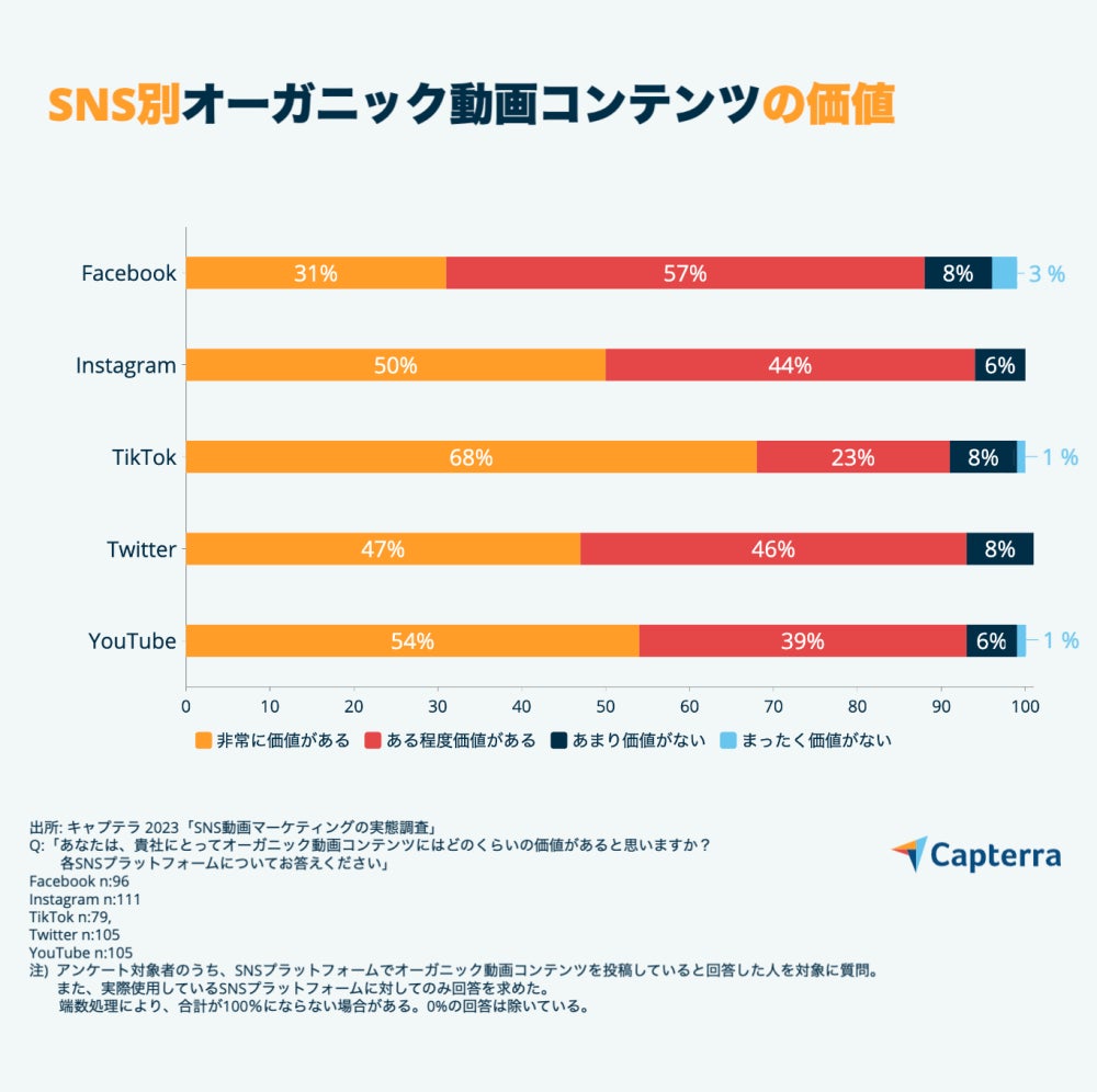 Q.「あなたは、貴社にとってオーガニック動画コンテンツにはどのくらいの価値があると思いますか?各プラットフォームについてお答えください」