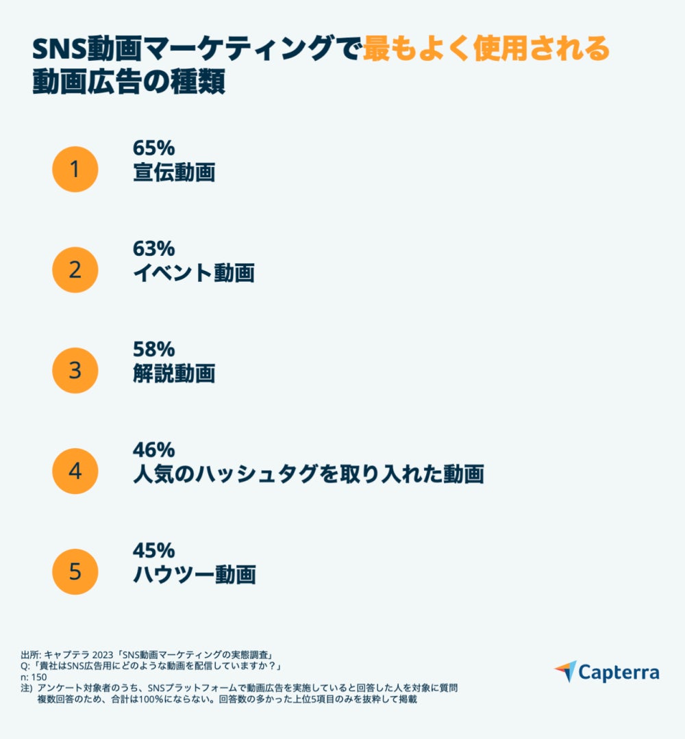 本調査の回答者の間では、宣伝動画やイベント動画が最も使用されている動画広告の種類でトップに上がりました。