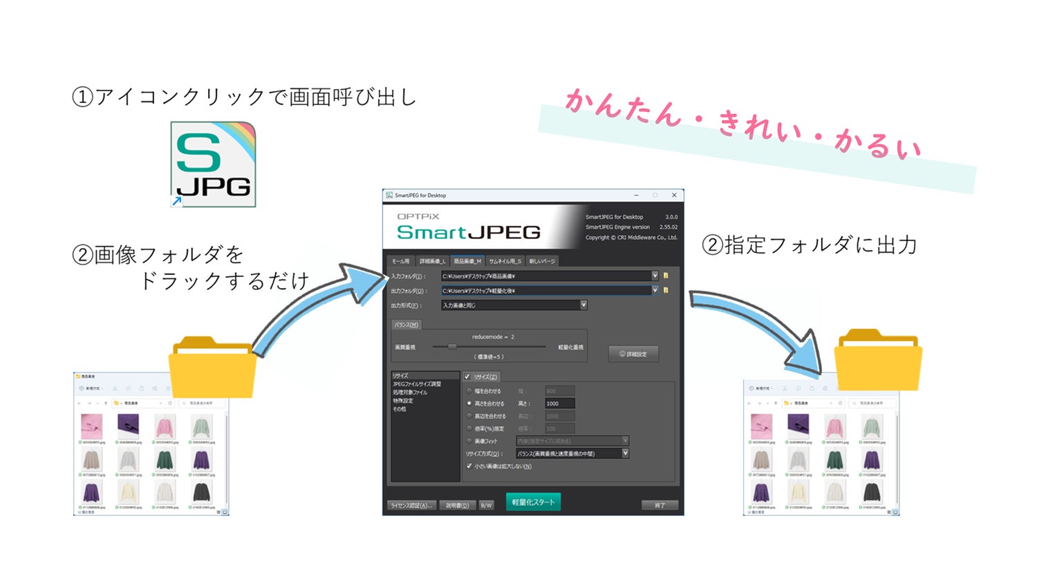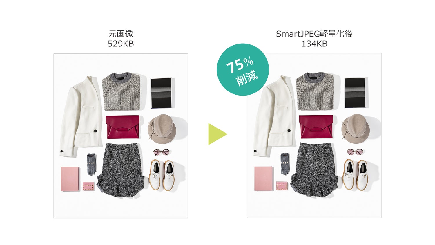 「SmartJPEG for Desktop」は、「画質を落とさず、重い画像を軽くする」画像軽量化ソリューションです。特別な知識がなくても、「どなたでも」「きれい」で「かるい」画像を、システム連携不要でお気軽にお使いいただけます。