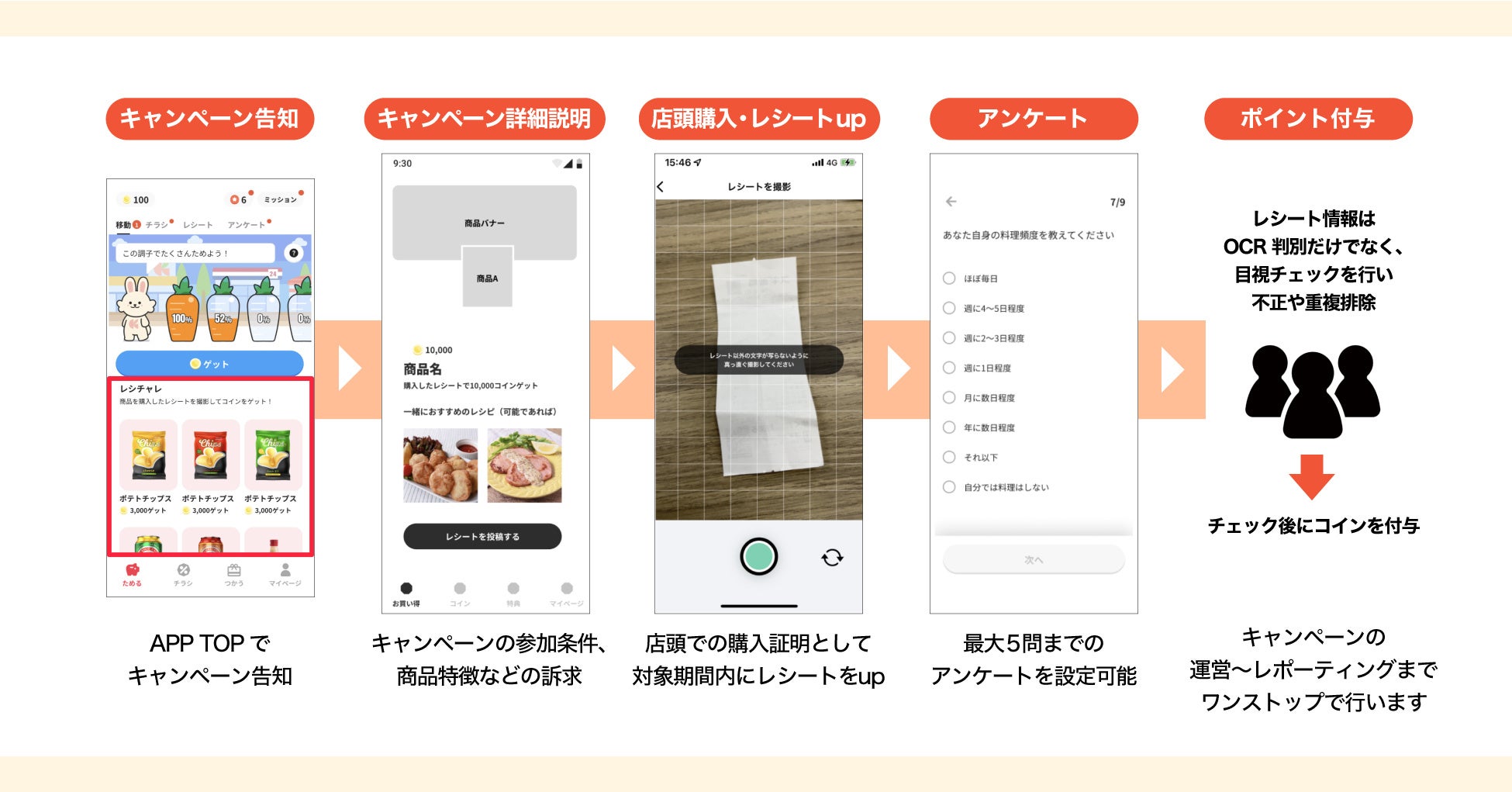 本メニューは、ユーザーが指定の商品を購入したレシート画像を送付することで「クラシルリワードコイン」を獲得できる「レシチャレ」機能を用いて、広告主が自社商品の新規トライアルユーザー獲得や店頭での売上向上を実現できる購買促進メニューです。