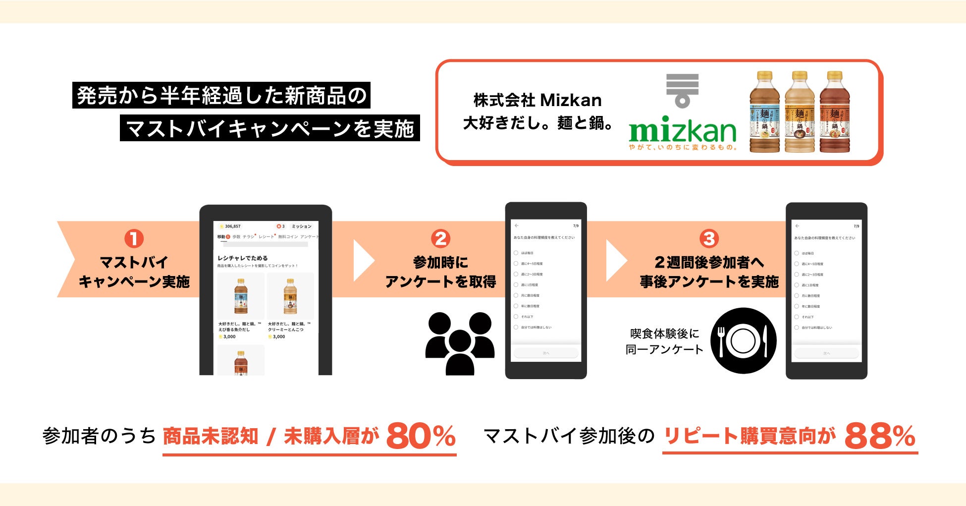 2023年2月に発売された株式会社Mizkanの「大好きだし。麺と鍋。」を対象に、同年7月から8月にかけて購入レシートアップロードで30円分相当のコイン還元を行う「マストバイキャンペーン」を実施したところ、2週間で数千枚のキャンペーン応募が集まり参加者のうち商品の未認知層が78.8%・未購買層が80.2%と高い比率を占める結果となりました。