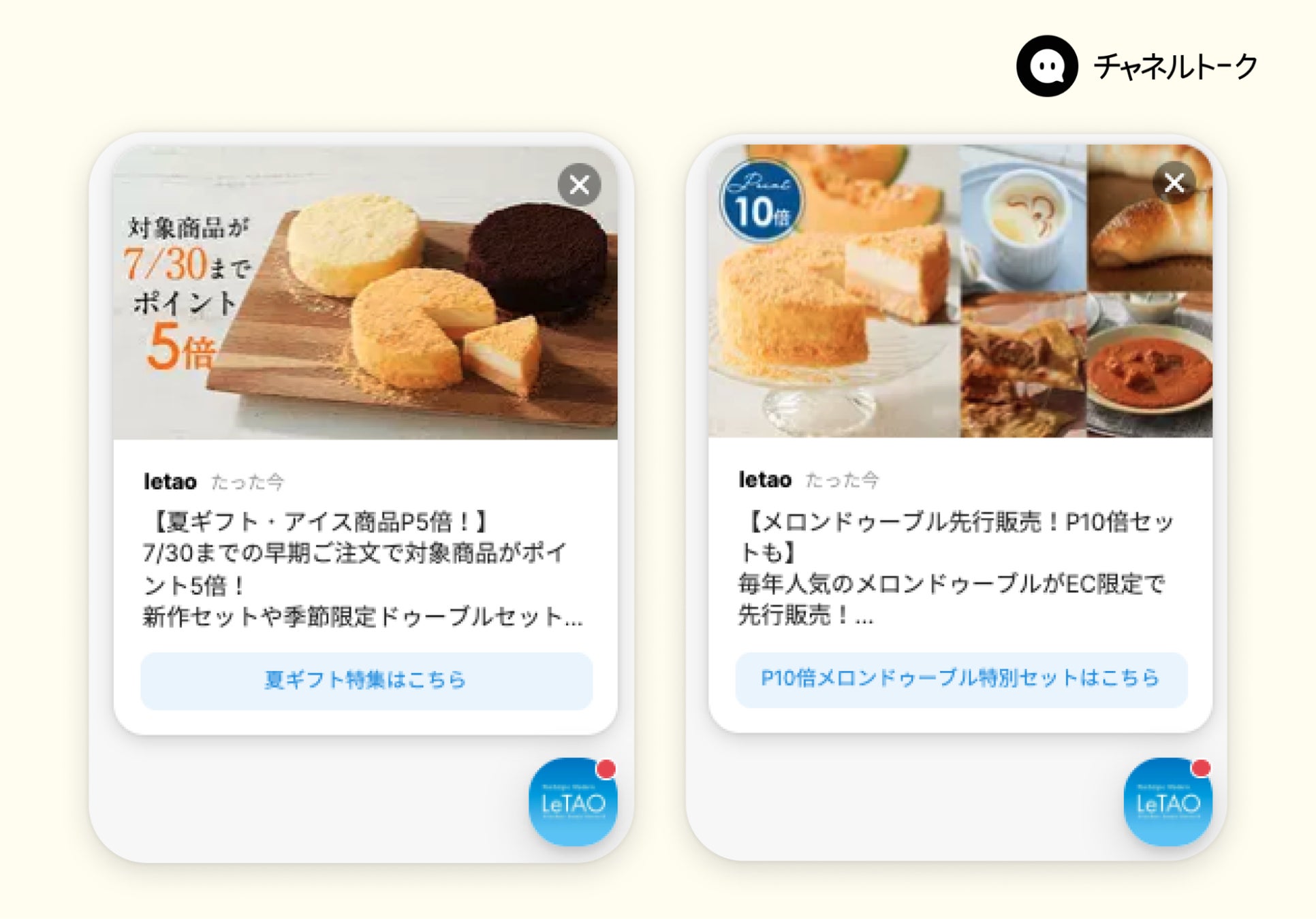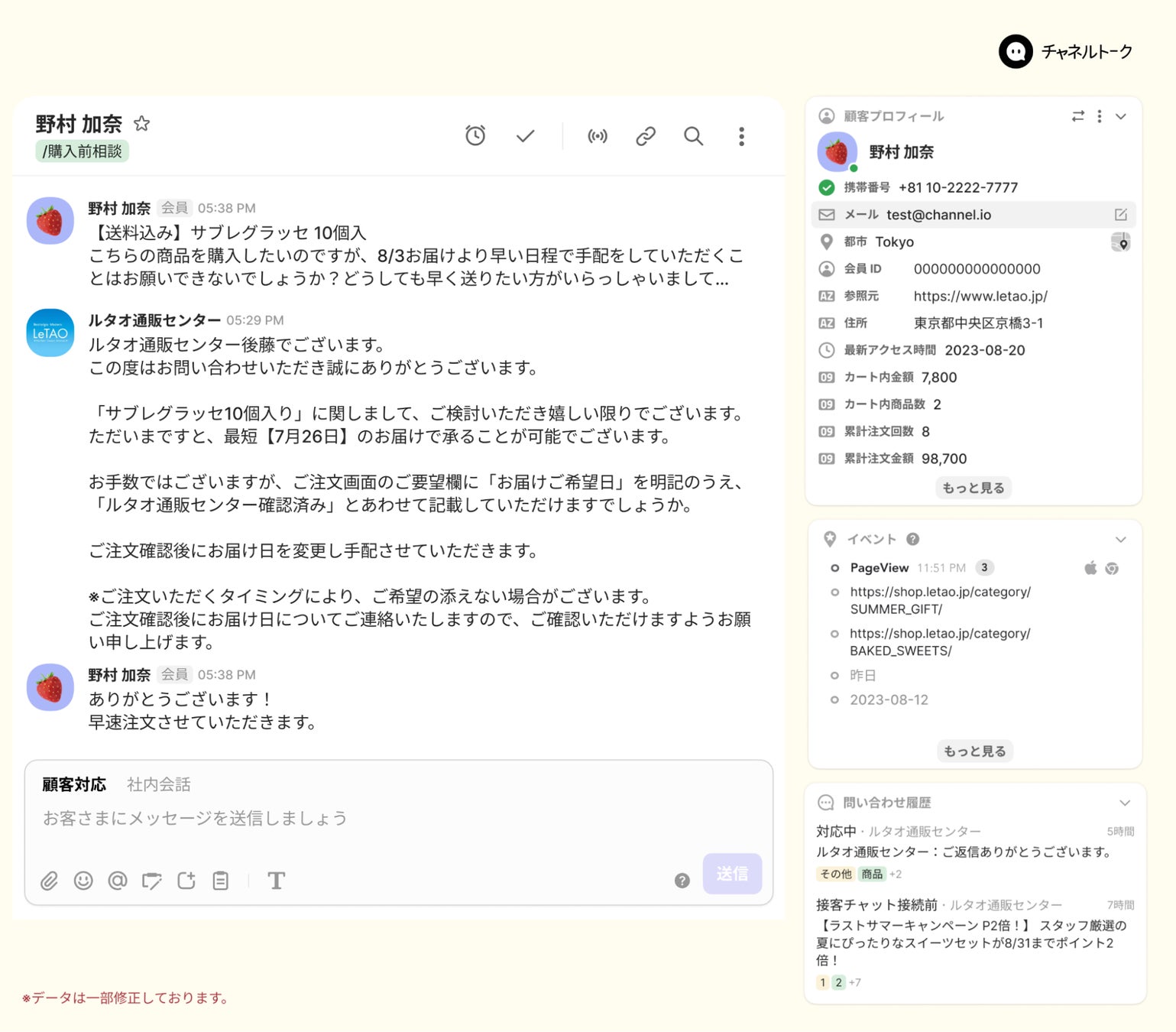北海道に本店を構え全国で愛されるスイーツブランド「小樽洋菓子舗ルタオ(LeTAO)」は、パティシエがこだわりぬいて創る美味しいスイーツで多くのリピーター・ファンから支持を集めています。特にECではリピーターやロイヤルカスタマーが多いことから、顧客ひとりひとりのさらなるロイヤリティ向上とECでの購買体験改善のため、チャネルトークを導入し1to1のチャット接客を開始いたしました。