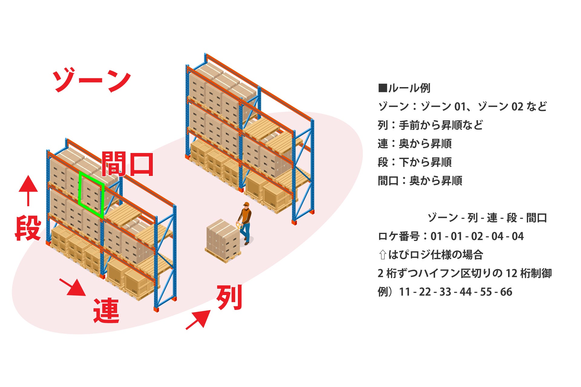 下図のように【ゾーン】–【列】–【連】–【段】–【間口】という形で区切り、商品の保管場所の番号・番地化を行います。ルール決め(手前から列1、列2…等)をしておくことでロケ番号を見てすぐに商品の場所にたどり着けます。