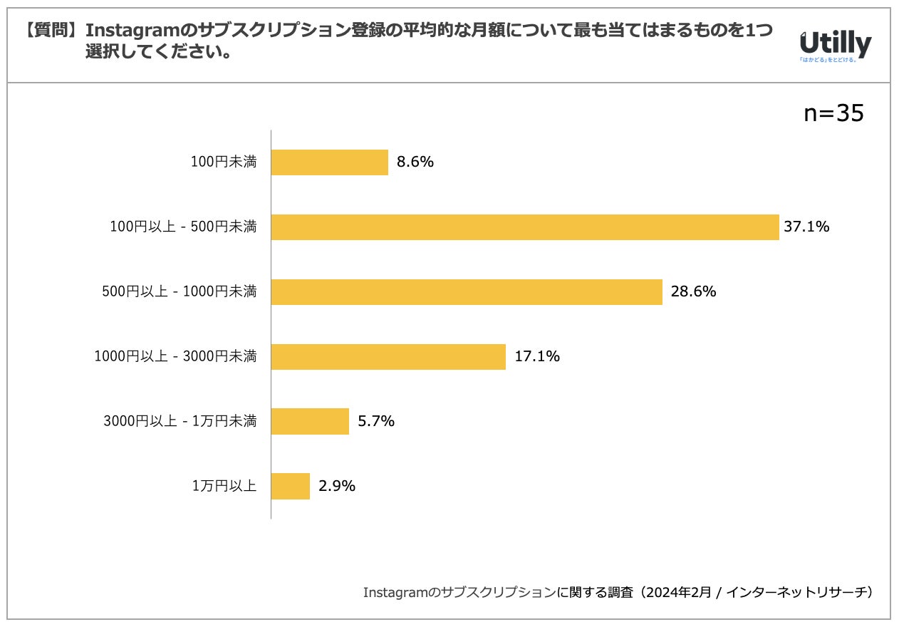 - Instagramサブスクリプション登録経験者の平均月額は100円以上500円未満が最も多く37.1%だった。月額1万円以上と回答した方は登録者経験者の2.9%であった。