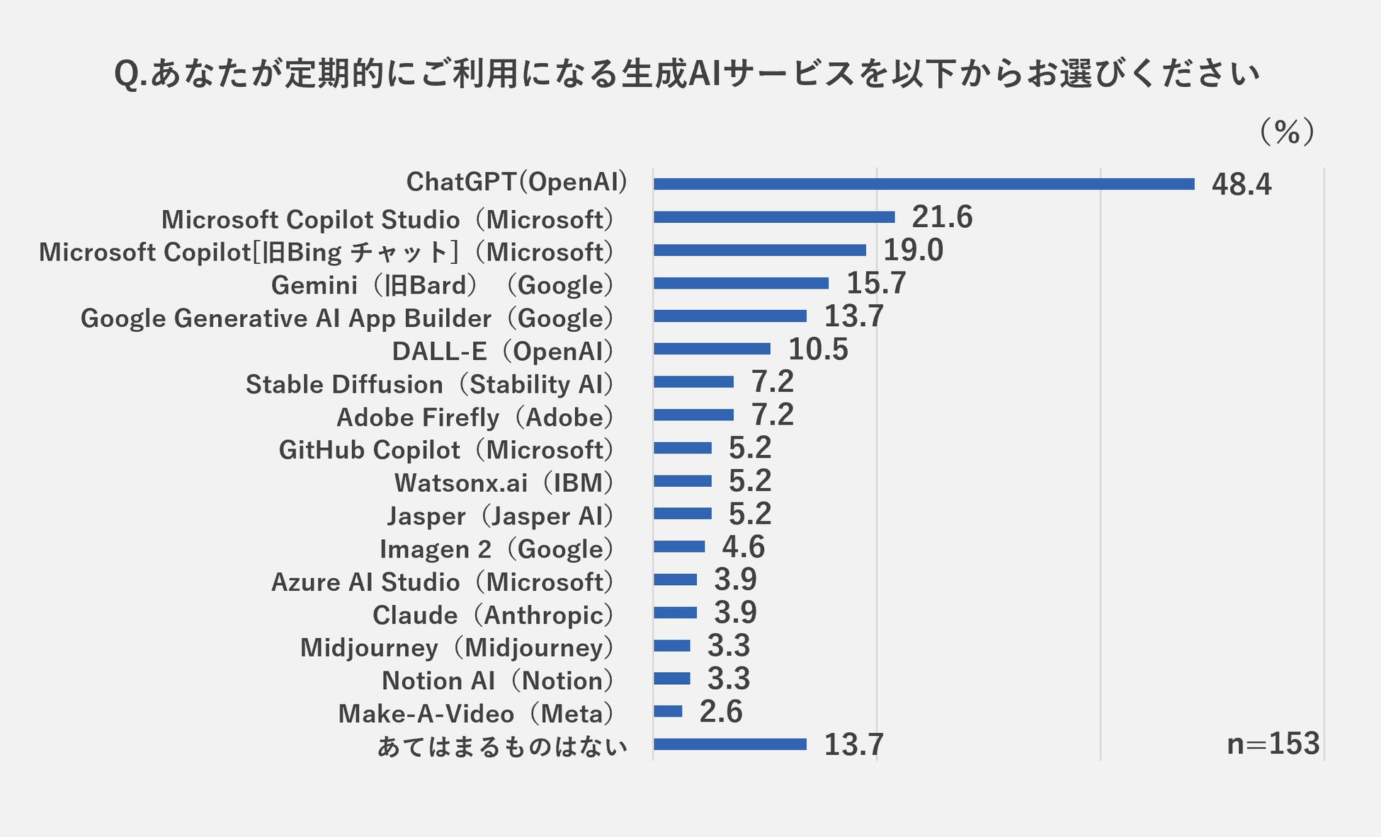生成AIの利用状況について「日常的に使っている」「ときどき使っている」と回答した人を対象に、定期的に利用している生成AIツールをたずねました。(※3)回答が多かった生成AIツールは多い順に「ChatGPT(OpenAI)」(48.4%)、「Microsoft Copilot Studio(Microsoft)」(21.6%)、「Microsoft Copilot[旧Bing チャット](Microsoft)」(19.0%)、「Gemini(旧Bard)(Google)」(15.7%)、「Google Generative AI App Builder(Google)」(13.7%)となりました。