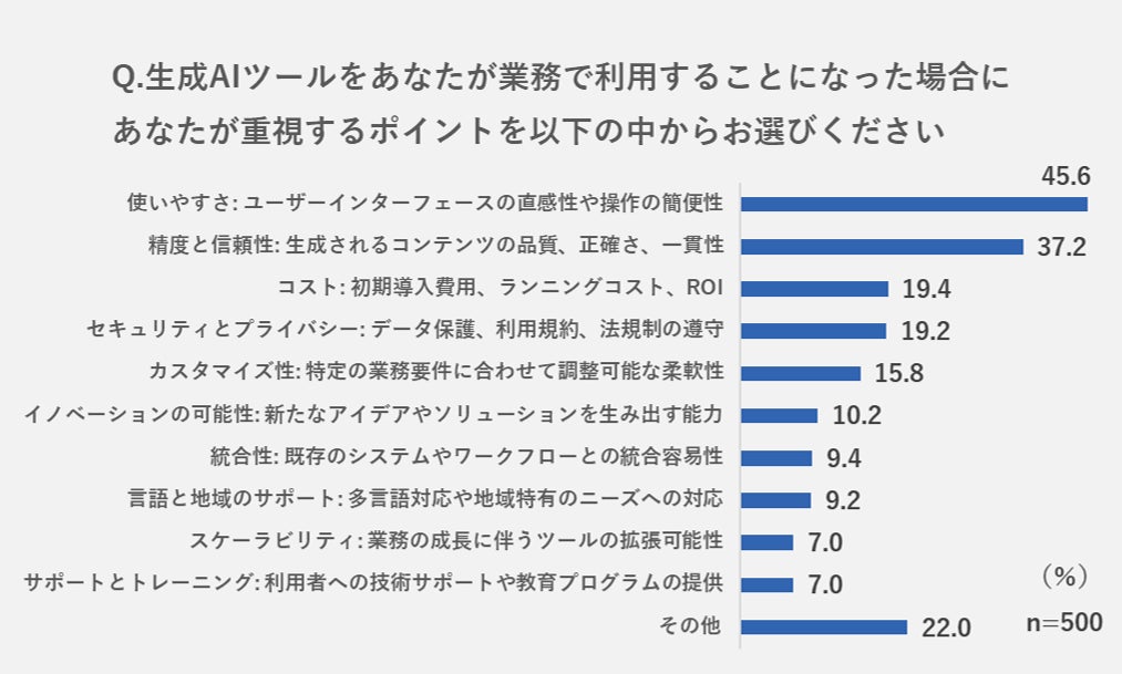 ・業務利用において最も重視するポイントは「使いやすさ」45.6%、次いで「精度と信頼性」37.2%