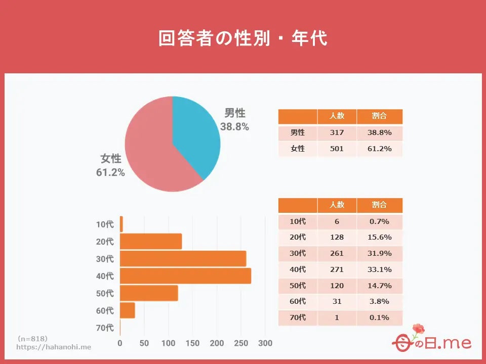 この調査は、母の日ギフト選びに悩む人々に有益な情報を提供し、より沢山のお母さんに喜んでもらえるプレゼント選びをサポートすることを目的として実施されました。アンケートは、全国の10代~70代の男女(計974名)を対象に行われ、母の日ギフトに対する意識や傾向が詳細に分析されています。