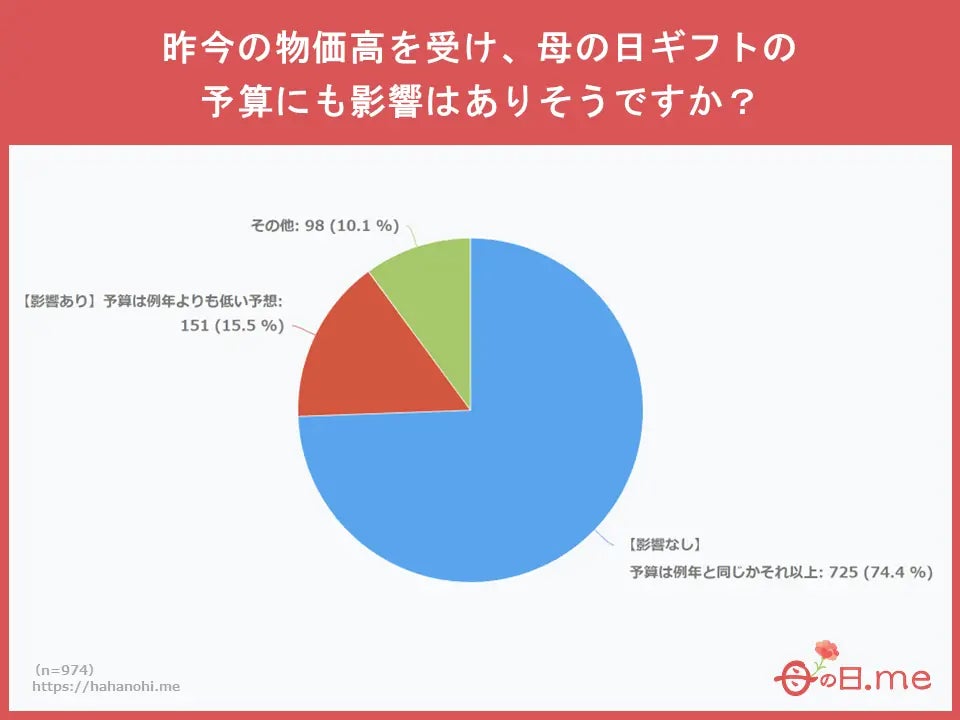 昨今の物価高が母の日ギフトの予算にも影響はありそうですか?というアンケート調査(n=974)によると、「【影響なし】予算は例年と同じかそれ以上」が74.4%で、最も多い結果となりました。「影響なし」と答えた人の中には、「毎年同じ金額の物を贈っている」「気持ちを贈るから影響なし」といったコメントもみられました。「【影響あり】予算は例年よりも低い予想」は15.5%で「家計の負担にしたくない」や「生活が苦しい」というコメントがありました。