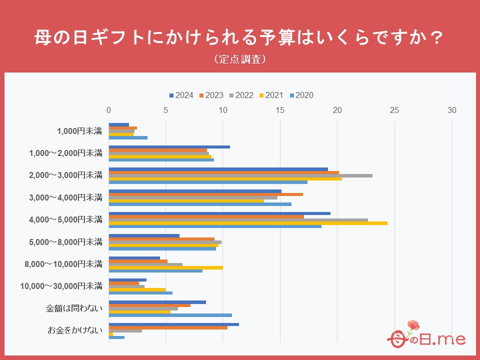 この度の意識調査アンケートで明らかになったのは、母の日ギフトを選ぶ際に、「プレゼント購入の予算はいくらか?」です。母の日のプレゼントを購入する予算は、子供からお母さんに贈るのか、夫から妻へ贈るのか、また、年齢やお母さんの趣向によっても変わるため、母の日.meでは毎年、母の日のプレゼント購入予算をアンケート調査により集計し、公表しています。今年の調査で一番多かった回答は「¥4,000~¥5,000」という回答が1位という結果になりました。また、2番目は「¥2,000~¥3.000」、3番目は「¥3,000~¥4,000」となり、1位から3位が¥2,000~¥5,000の間に収まる結果となり、その合計の割合は全体の約半数となる事が分かりました。また、一方では「お金をかけない」という回答も昨年から増えてきており、母の日にプレゼントを購入しない家庭が増えつつある傾向がある事もわかりました。