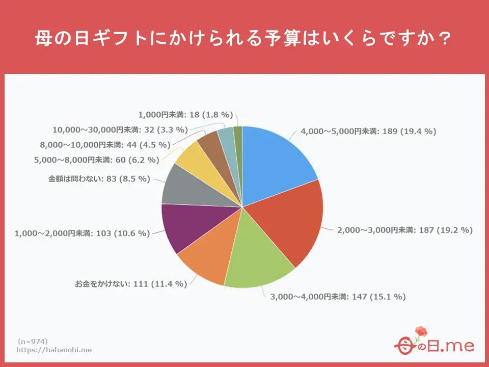 母の日.meが行った母の日の予算に関するアンケート(n=974)では、「4,000~5,000円未満」と答えた人が一番多く19.4%と、前年から2ポイント増加する結果となりました。「ちょうどいい金額」「このくらいの金額のほうが商品の種類が多い」といった理由がある中、「母に気を遣わせない金額である」といった、お母さんを気遣うコメントもありました。