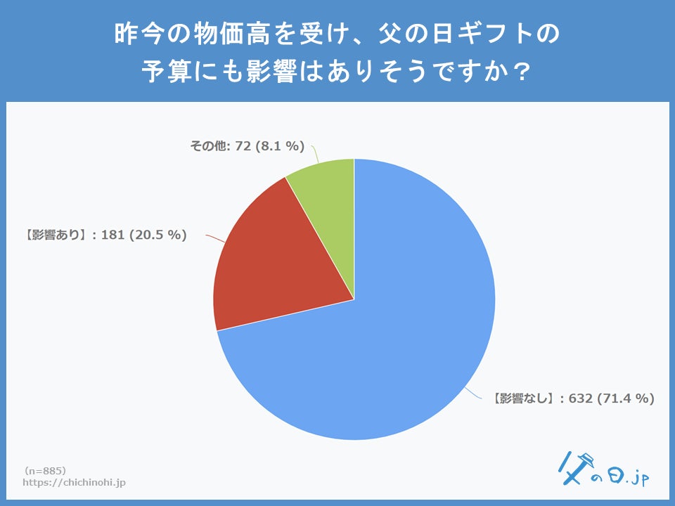 昨今の物価高が父の日ギフトの予算にも影響はありそうですか?というアンケート調査(n=885)によると、「【影響なし】予算は例年と同じかそれ以上」が71.4%で、最も多い結果となりました。「【影響あり】予算は例年よりも低い予想」は20.5%という結果になりました。