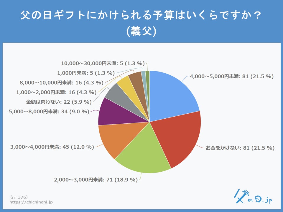 義父への父の日ギフトにかける予算に関するアンケートでは、「4,000~5,000円未満」と「お金をかけない」が同票で21.5%となりました。実のお父さんのアンケートと比べると3ポイント増えています。また、実のお父さんのアンケートと同様、「お金をかけない」と回答した人が僅差で2位となりました。