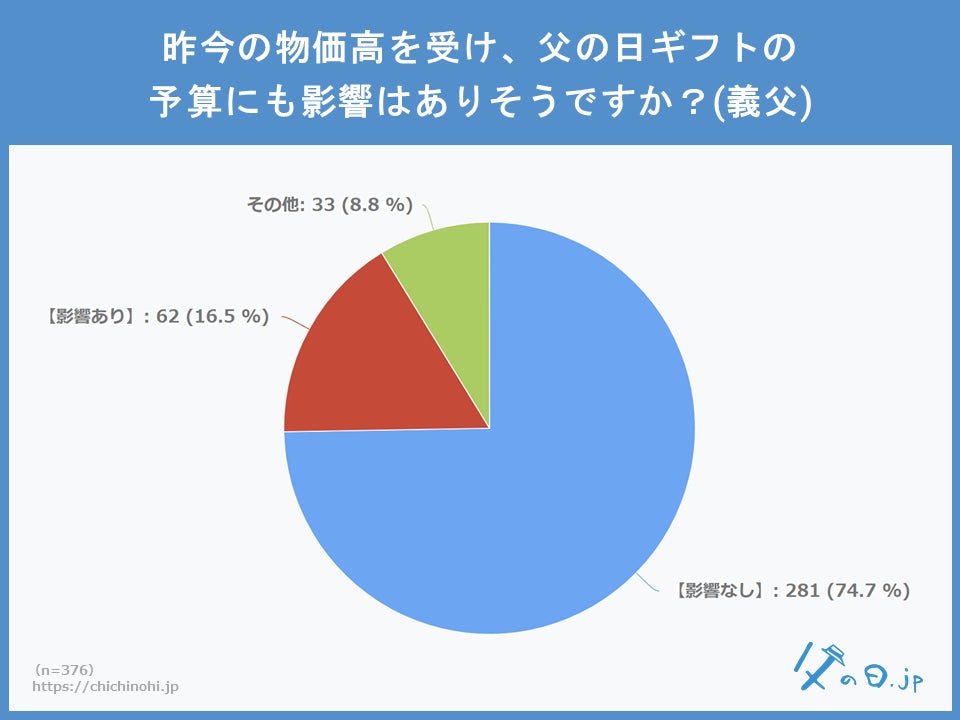 昨今の物価高が父の日ギフトの予算にも影響はありそうですか?というアンケートでは「【影響なし】予算は例年と同じかそれ以上」が74.7%で、物価高に左右されず、義父にも父の日ギフトを贈るという人が最も多い結果となました。